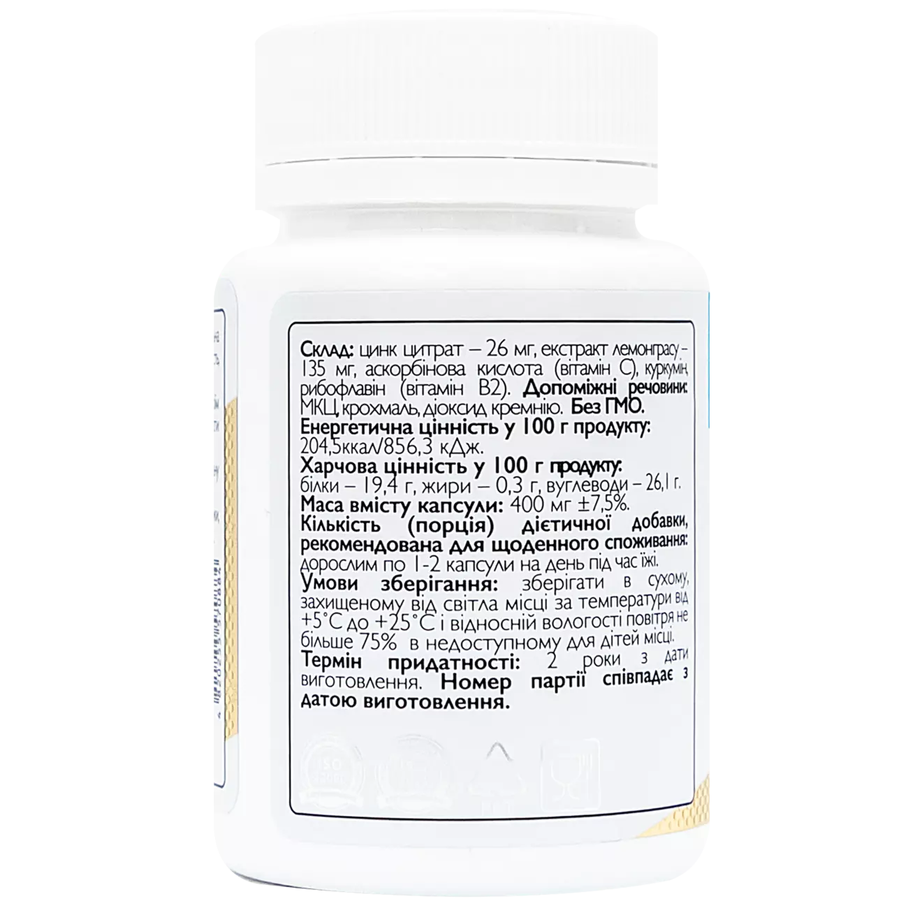 Цинк цитрат –26 мг, екстракт лемонграсу – 135 мг, аскорбінова