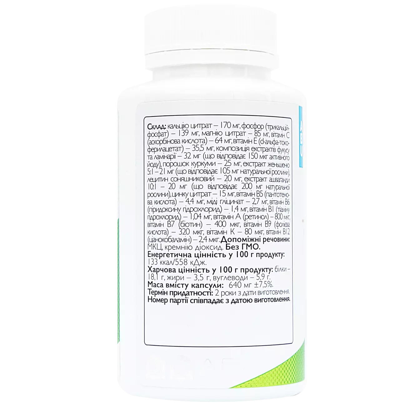 Кальцію цитрат – 170 мг, фосфор (трикальційфосфат) – 139 мг, магнію цитрат – 85 мг, вітамін С (аскорбінова кислота) – 64 мг, вітамін Е (d-альфа-токоферилацетат) – 35,5 мг, композиція екстрактів фукусу та ламінарії – 32 мг (що відповідає 150 мкг активного йоду), порошок куркуми – 25 мг, екстракт женьшеню 5:1 – 21 мг (що відповідає 105 мг натуральної рослини), лецитин соняшниковий – 20 мг, екстракт ашваганди 10:1 – 20 мг (що відповідає 200 мг натуральної рослини), цинку цитрат – 15 мг, вітамін В5 (пантотенова кислота) – 4,4 мг, міді гліцинат – 2,7 мг, вітамін В6 (піридоксину гідрохлорид) – 1,4 мг, вітамін В1 (тіаміну гідрохлорид) – 1,04 мг, вітамін А (ретинол) – 800 мкг, вітамін В7 (біотин) – 400 мкг, вітамін В9 (фолієва кислота) – 320 мкг, вітамін К – 80 мкг, вітамін В12 (ціанокобаламін) – 2,4 мкг.