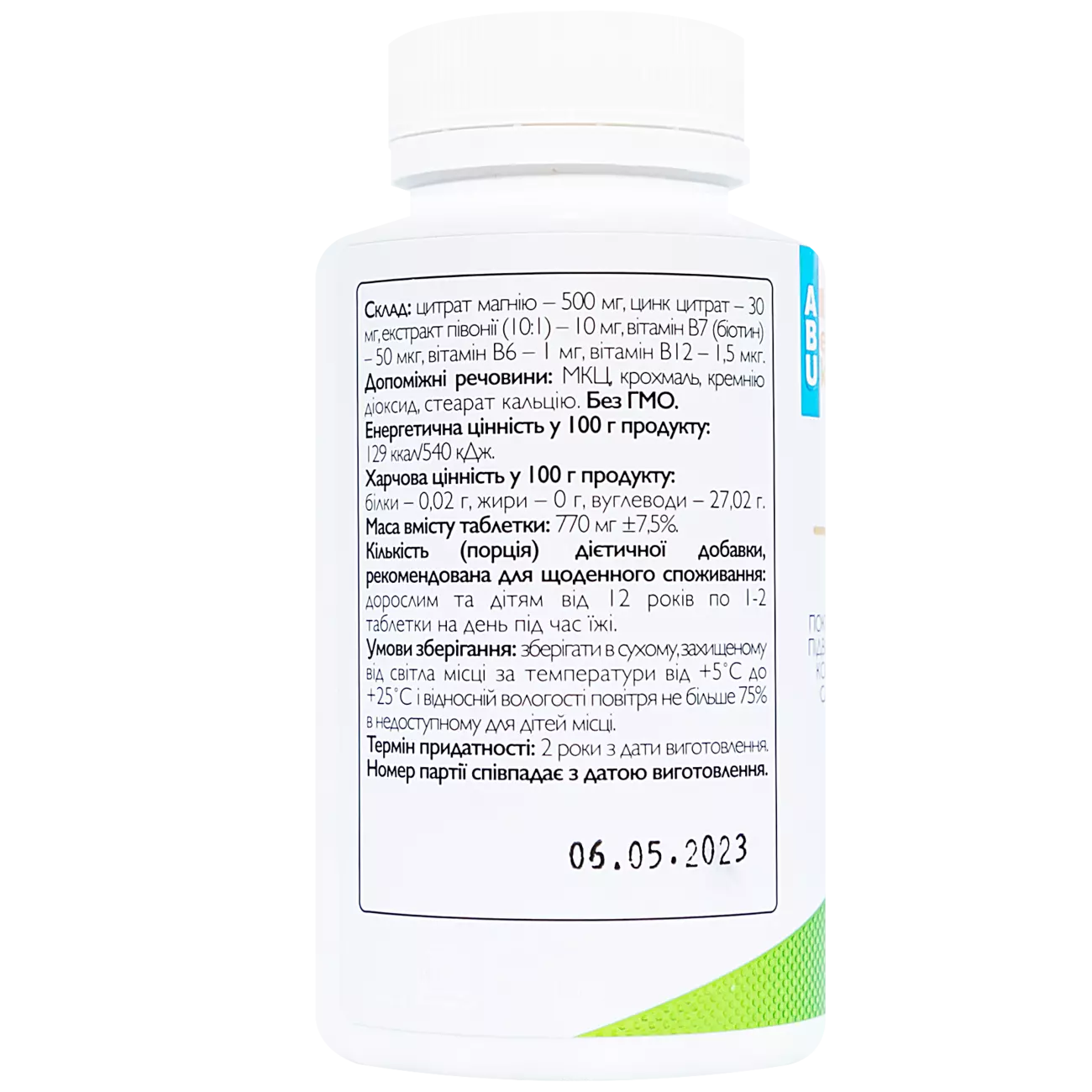 Цитрат магнію – 500 мг, цинк цитрат – 30 мг, екстракт півонії