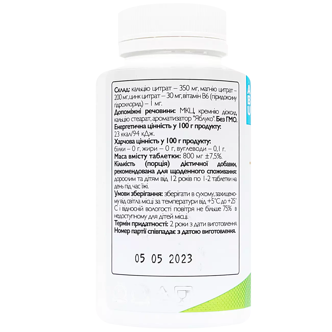 Кальцію цитрат – 350 мг, магнію цитрат – 200 мг, цинк цитрат – 30 мг, вітамін B6 (піридоксину гідрохлорид) – 1 мг. Допоміжні речовини: МКЦ, кремнію діоксид, кальцію стеарат, ароматизатор "Яблуко".